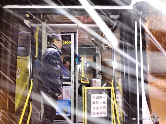 迎著風(fēng)雪,首班車順利發(fā)車