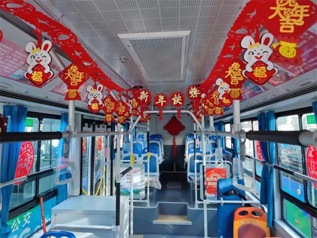 在209路車隊,車廂、站務(wù)室、辦公區(qū)域處處洋溢著喜慶的中國風(fēng),生肖窗花張貼在車窗兩側(cè),可愛的卡通兔“微笑”著向乘客們送著“祝?!?,“新年快樂”的拉花昭示著中華民族的傳統(tǒng)佳節(jié)即將到來。