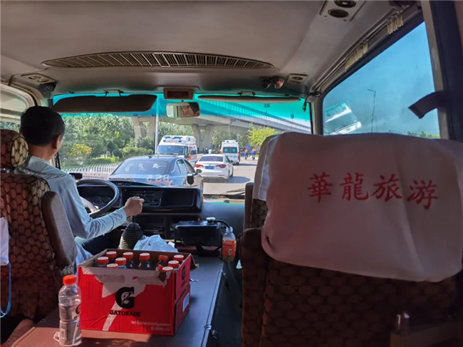 比賽開(kāi)始后,為保障參賽選手的安全,華龍公司5臺(tái)中巴車輛又化身“賽道收容車”,緊跟在組委會(huì)領(lǐng)頭車輛身后,沿著參賽選手的比賽路線,一路伴隨著參賽選手行駛,為比賽途中發(fā)生意外及體力不支的運(yùn)動(dòng)員提供幫助。
