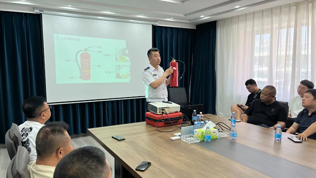 會(huì)議室內(nèi),黃教官通過(guò)課件和實(shí)操相結(jié)合的形式,用一件件真實(shí)發(fā)生的案例向大家講解了各類(lèi)火災(zāi)的特點(diǎn)與應(yīng)對(duì)方法,以及遇到汛情及臺(tái)風(fēng)時(shí)的處理辦法等,并通過(guò)“提、拔、握、壓”四字口訣教會(huì)大家如何正確使用滅火器。